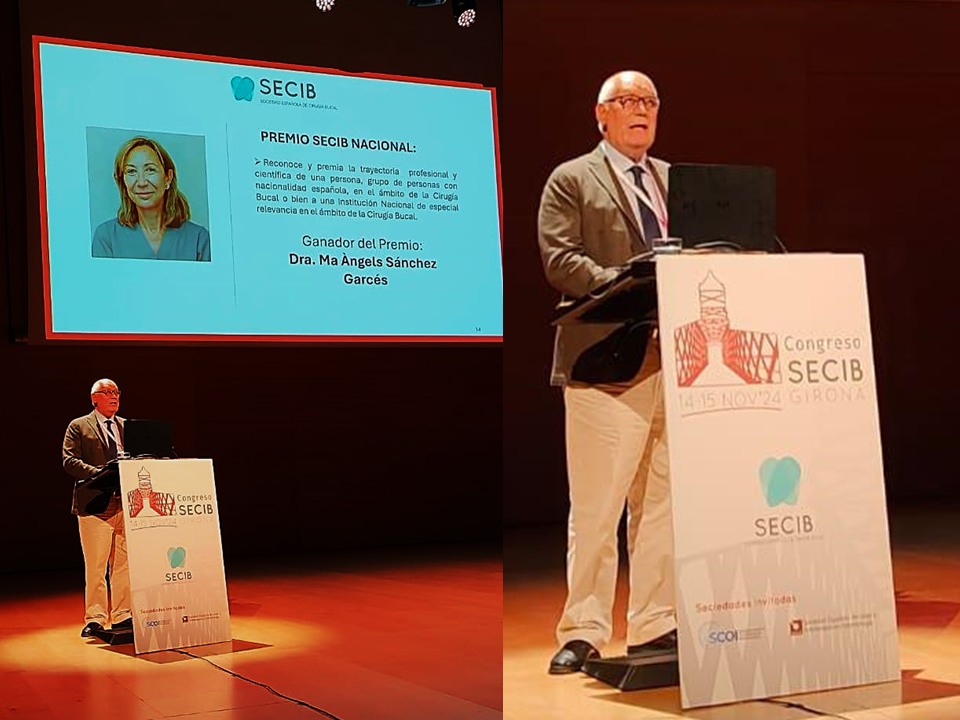 En el marco del XXI Congreso de la Sociedad Española de Cirugía Bucal (SECIB), celebrado en Girona durante los días 14 y 15 de noviembre, se efectuó un acto para entregar los Premios de la SECIB 2024, entre los cuales el Premio Nacional SECIB 2024 que fue entregado a la Profesora Dra. María Ángels Sánchez Garcés, por parte del actual presidente de la SECIB, el Prof. Dr. Daniel Torres Lagares y con la presencia de la nueva presidenta de la SECIB la Profesora Dra. Agurne Uribarri Etxebarria.